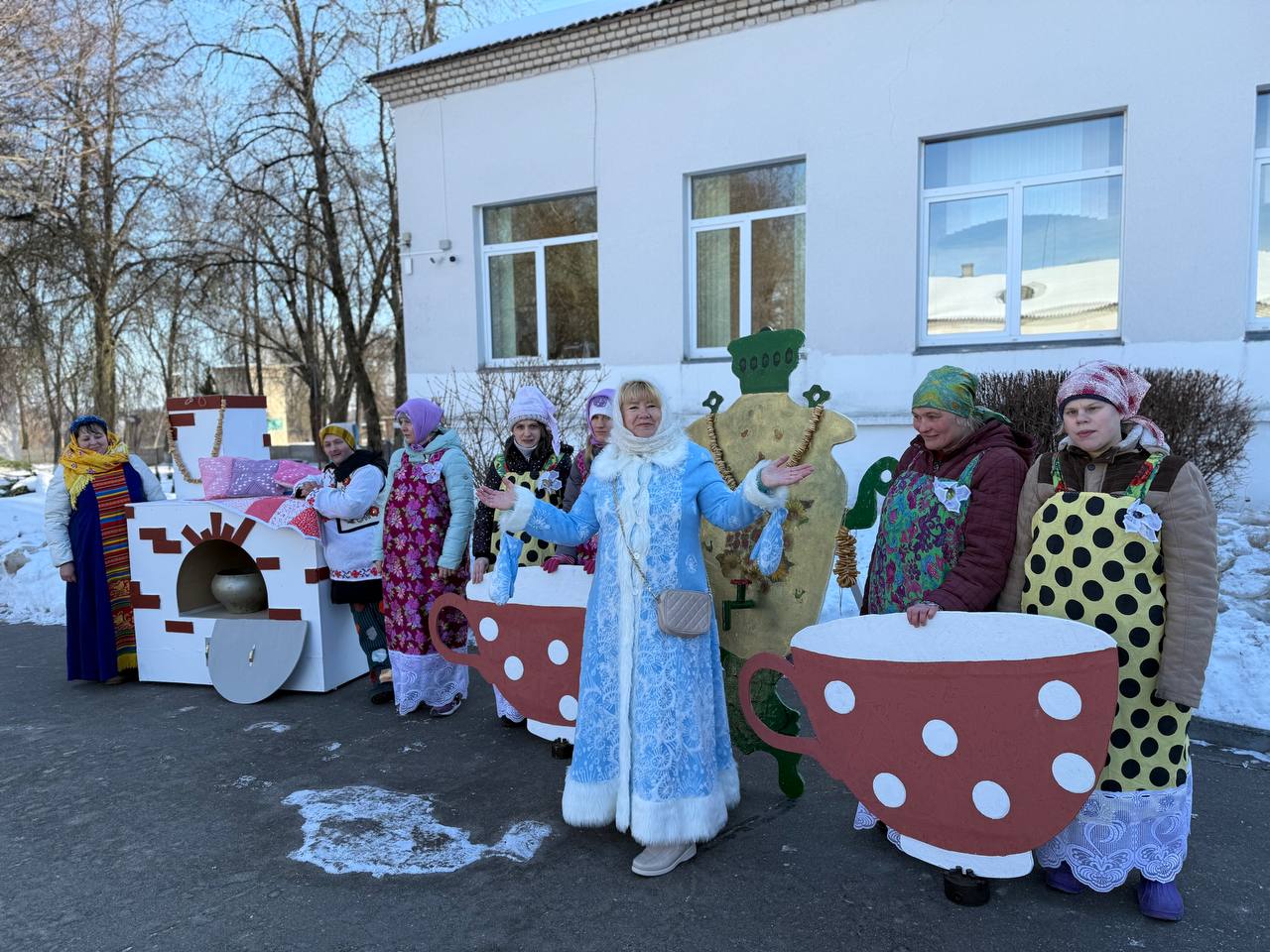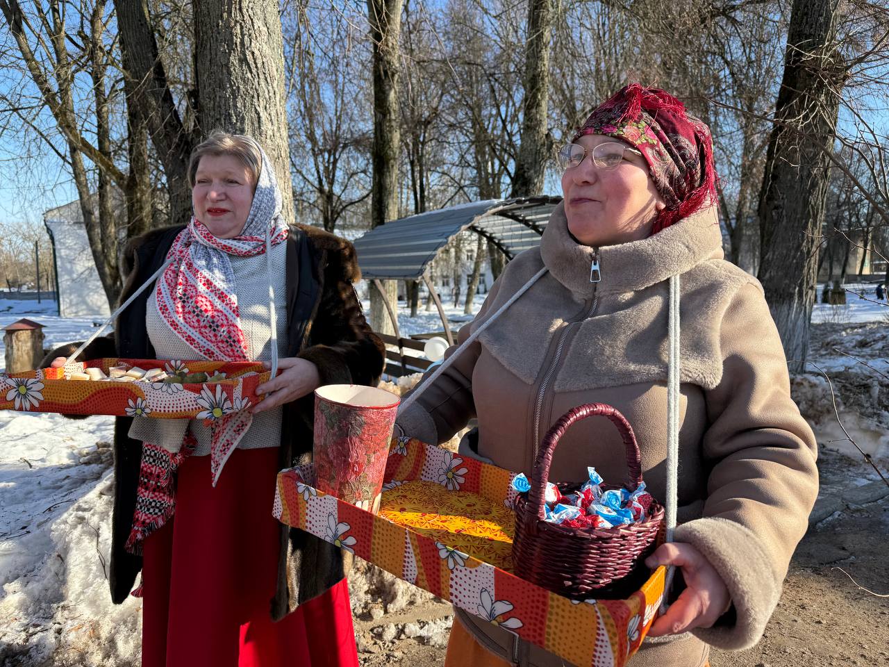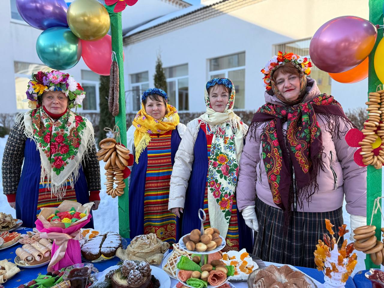 У входа в Грозовский социальный пансионат было видно, что здесь проходит настоящая Масленица. Работники социального пансионата встречали гостей у входа в цветастых платках, красочных нарядах.